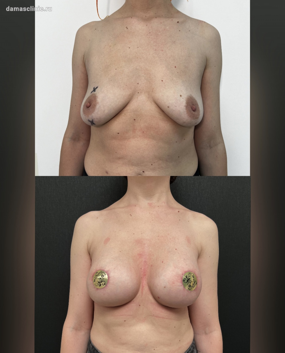 • Увеличение груди имплантами с одномоментной подтяжкой по ареоле до и в период первичной реабилитации