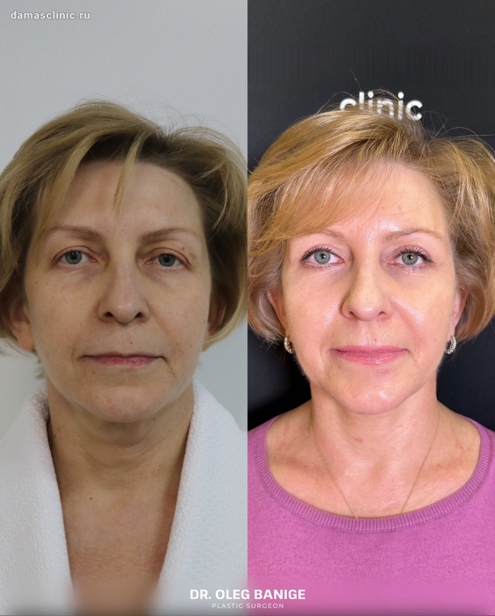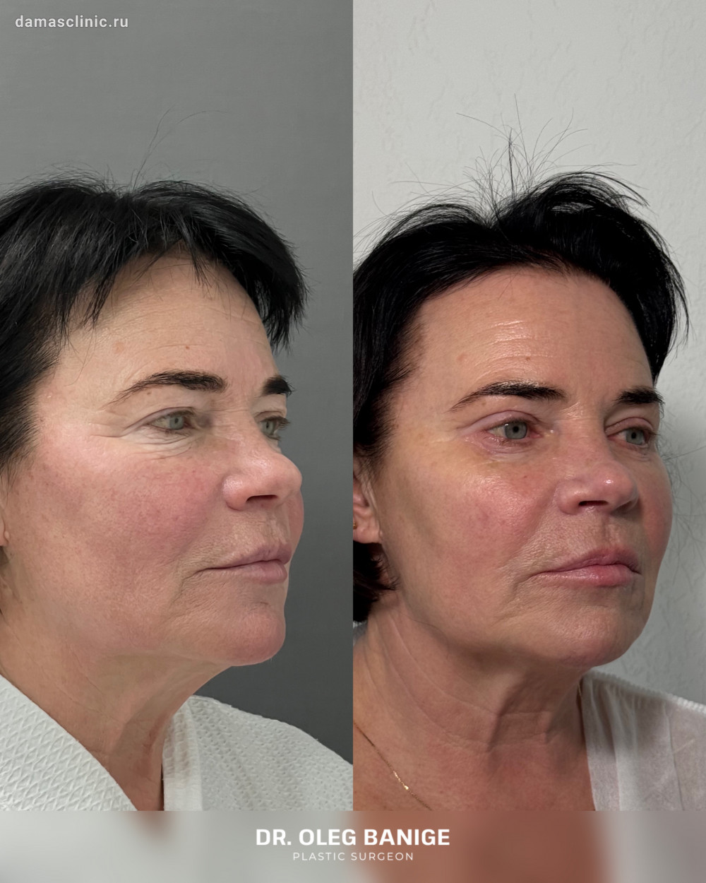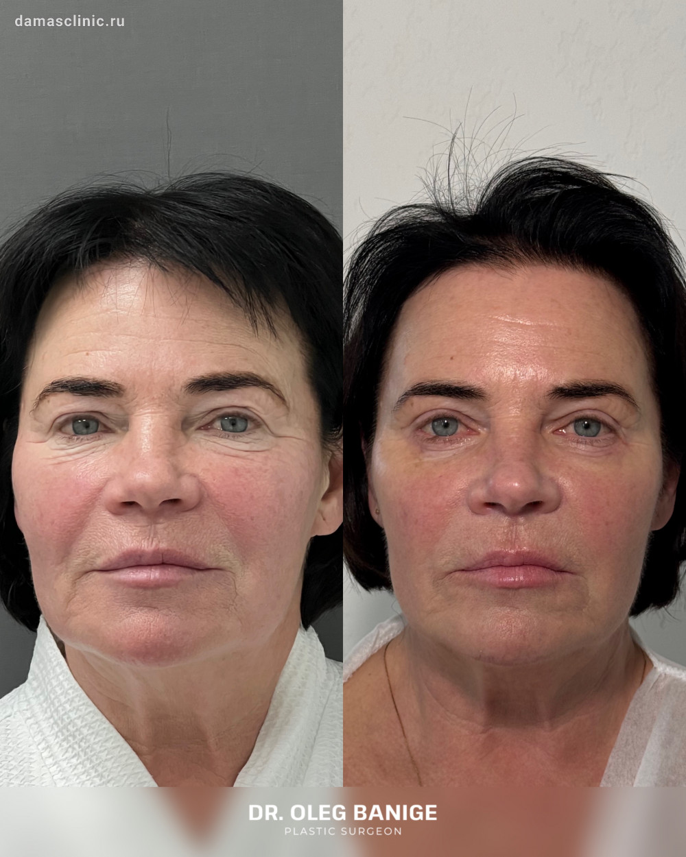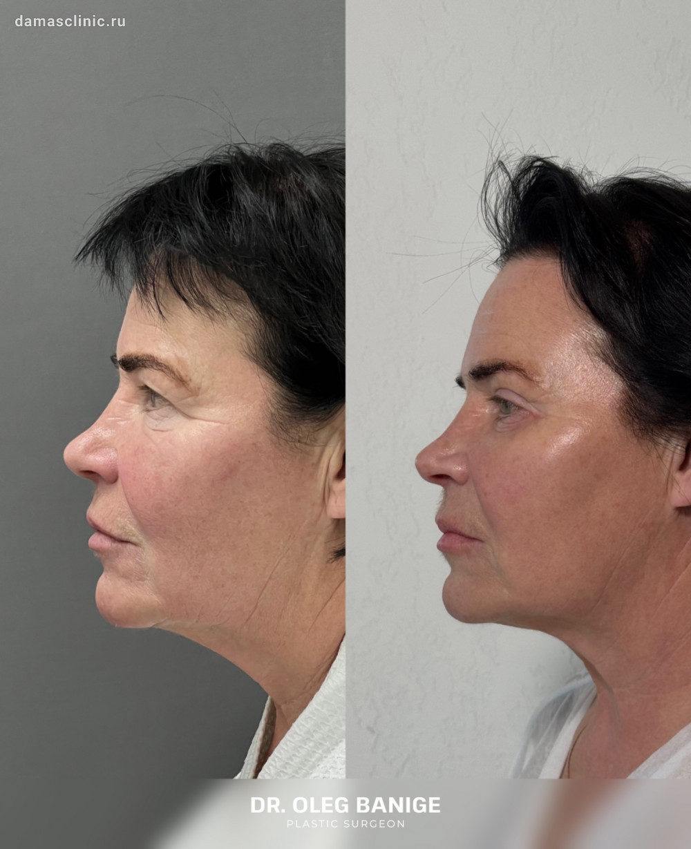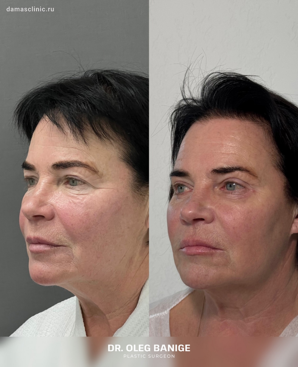 Комплексная пластика лица: SMAS-лифтинг нижней трети, подтяжка височной зоны, передняя платизмопластика и круговая пластика век до и в период первичной реабилитации. Работа доктора Олега Николаевича Банижа