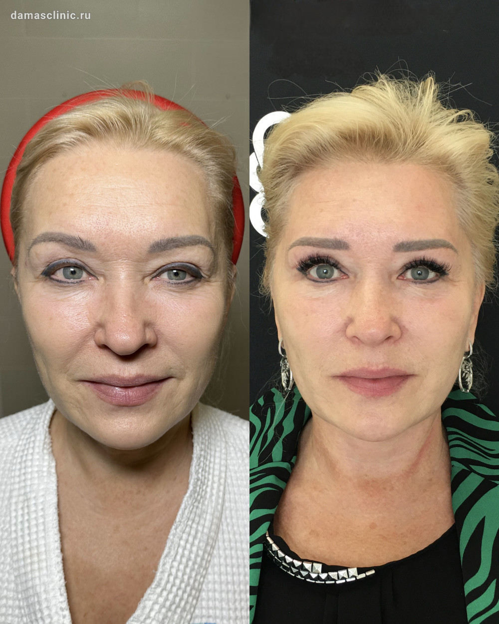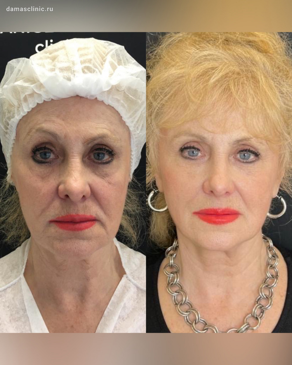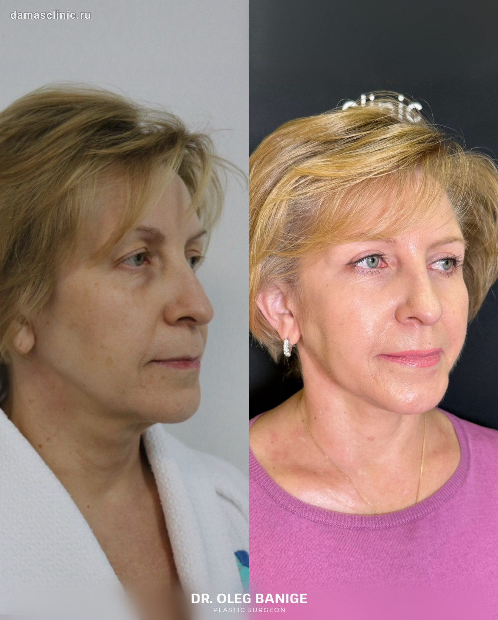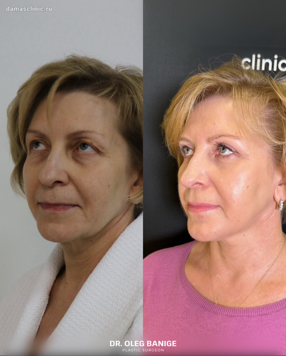 Комплексная пластика лица: SMAS-лифтинг нижней трети, подтяжка височной зоны, передняя платизмопластика и круговая пластика век до и в период первичной реабилитации. Работа доктора Олега Николаевича Банижа